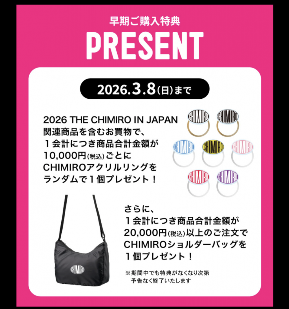 3月8日(日)23時59分までに「2026 THE CHIMIRO IN JAPAN」関連商品を含むお買物をされた方には、
